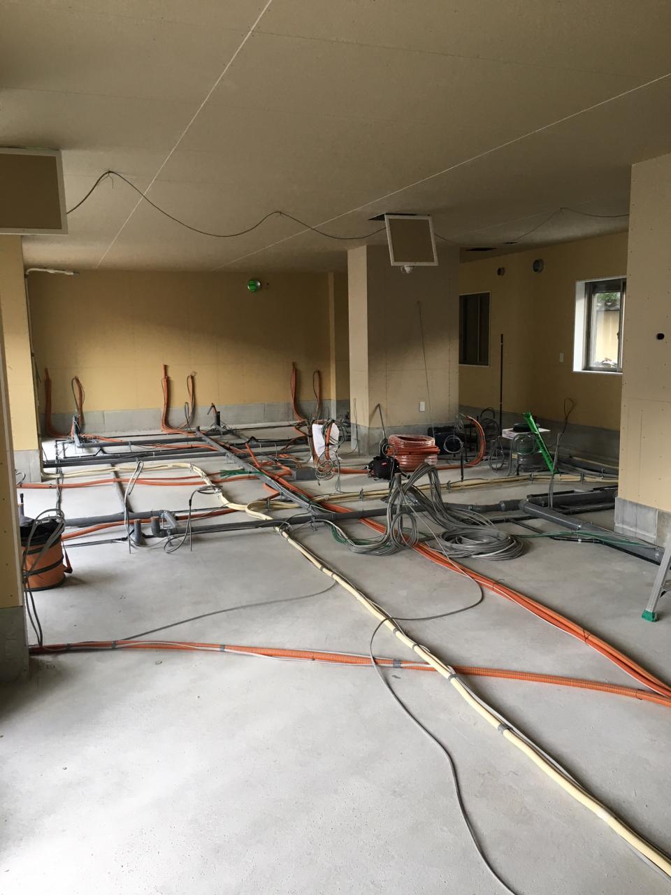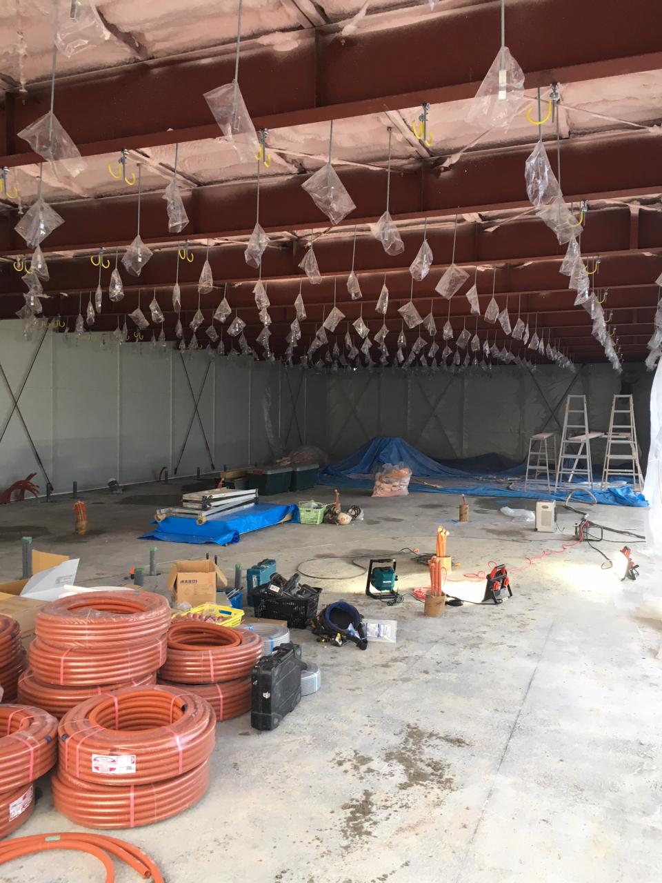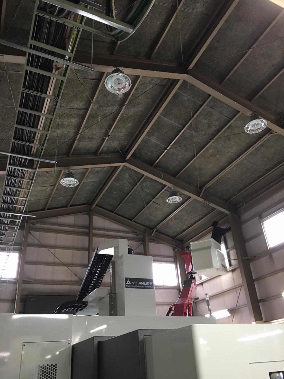お疲れ様です! 無電極ランプ型投光器の増設工事! 天井が高い為高所作業車での作業です。